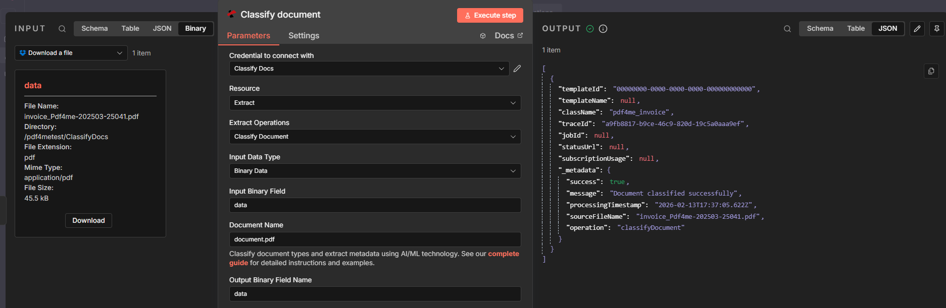 /pdf4metest/ClassifyDocs/invoice_Pdf4me-202503-25041.pdf). Puts the file in a binary field (e.g.data). - Classify document (PDF4me) — Sends that PDF to PDF4me using your saved classification templates. Output: className (e.g.