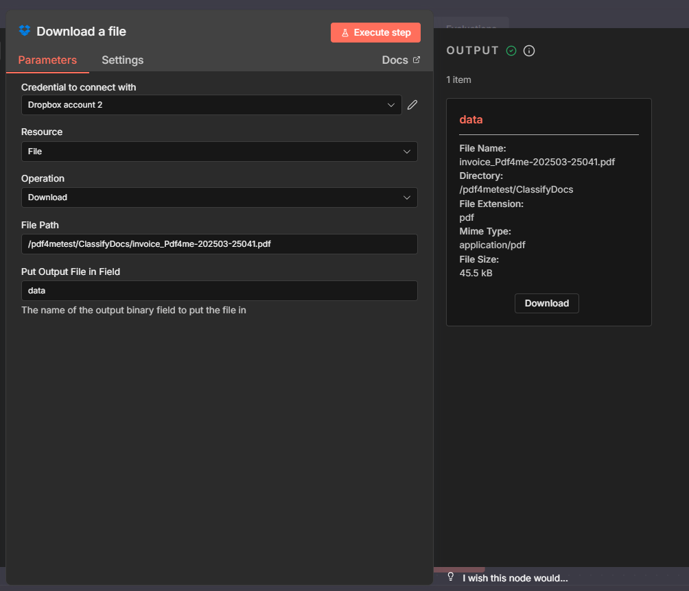 - n8n only runs the classification. Download a PDF (e.g. from Dropbox) and pass its binary field (data) to PDF4me – Classify document. The node returns className (e.g.