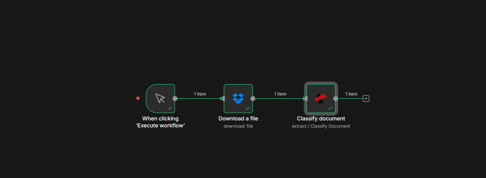 - A file source — We use Dropbox – Download a file so the steps match our screenshots. You can use Google Drive, HTTP Request, or any node that supplies binary PDF data. The flow stays the same: get the PDF → Classify document → use className in the next node.