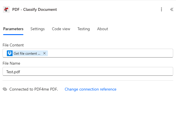 The fix: Define your classification rules on dev.pdf4me.com (using regex or JavaScript expressions), then run the same classification inside Power Automate: get a PDF (e.g. from Dropbox) → PDF4me Classify Document → use the returned Class Name to route or organize. Classification lives in your PDF4me account; Power Automate just sends the file and gets back the class.