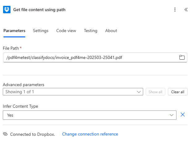 /pdf4metest/classifydocs/invoice_pdf4me-202503-25041.pdf. - Infer Content Type — Set to Yes so Power Automate detects the file type correctly.