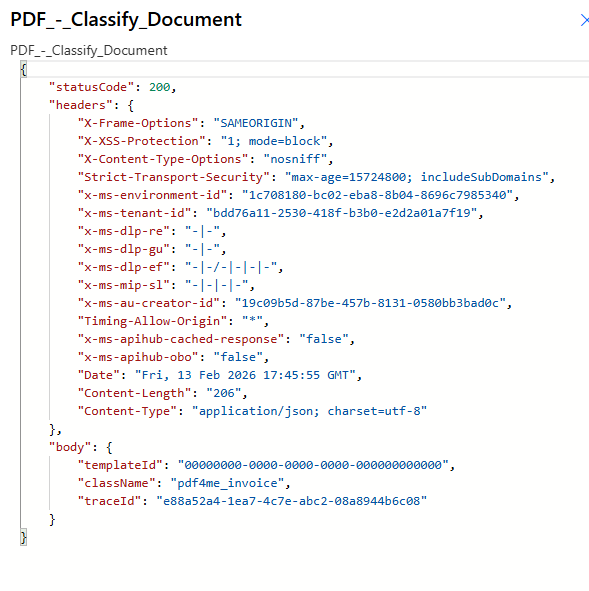 The PDF - Classify Document output includes body.className (e.g. pdf4me_invoice). In subsequent actions you can use Class Name to route the document (e.g. to different folders or flows), rename files, or trigger type-specific actions. The JSON response shows statusCode: 200 and body.className: "pdf4me_invoice" when classification succeeds.