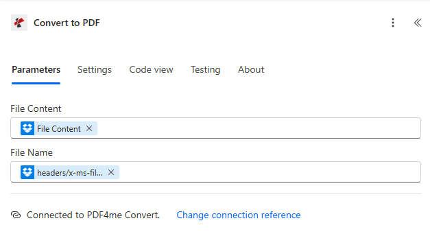- Add PDF – Convert to PDF (PDF4me). Sign in or select your PDF4me connection.
