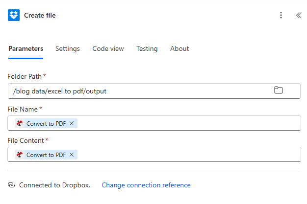 /blog data/excel to pdf. - Save the trigger. In Dynamic content, confirm you see File Content and a file name field (sometimes under