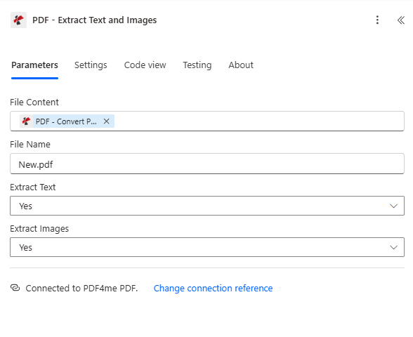 - Add PDF4me → PDF – Extract Text and Images.