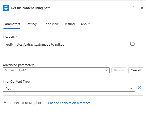 /pdf4metest/extracttext/image to pdf.pdf. Use the folder icon to browse if needed. - Advanced parameters → Infer Content Type — Set to Yes.