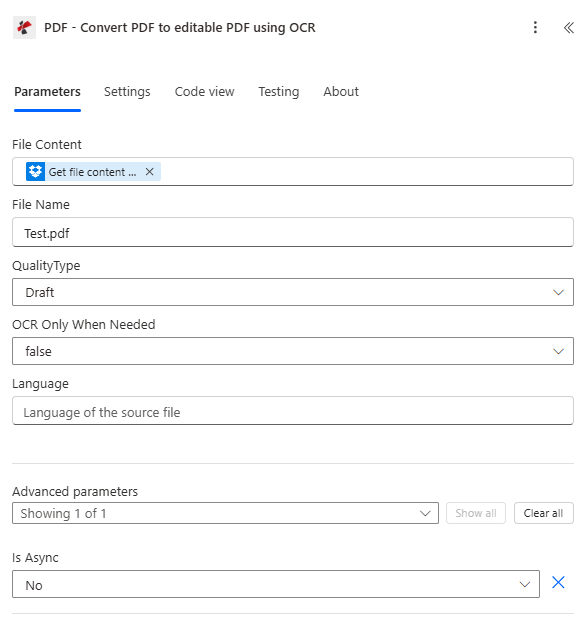 en) if needed for better OCR accuracy. - Is Async — No for synchronous (recommended for flows).