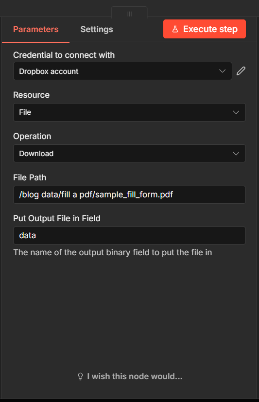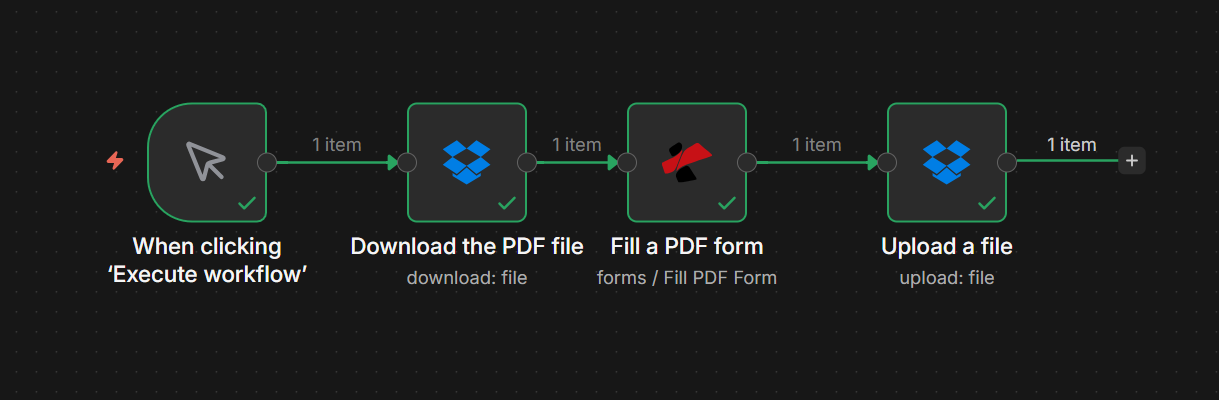 Input: A fillable PDF form in Dropbox and JSON (pasted or from a previous node) with matching field names. Output: A completed PDF with all fields populated, ready to save, email, or pass to the next node.