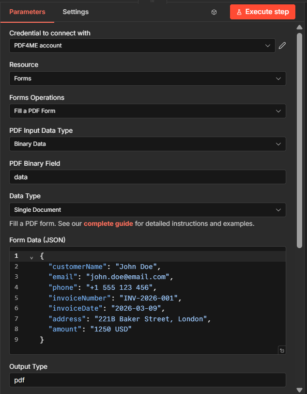 {"customerName":"John Doe","email":"[email protected]","phone":"+1 555 123 456","invoiceNumber":"INV-2026-001","invoiceDate":"2026-03-09","address":"221B Baker Street, London","amount":"1250 USD"}. - Output Type — pdf.