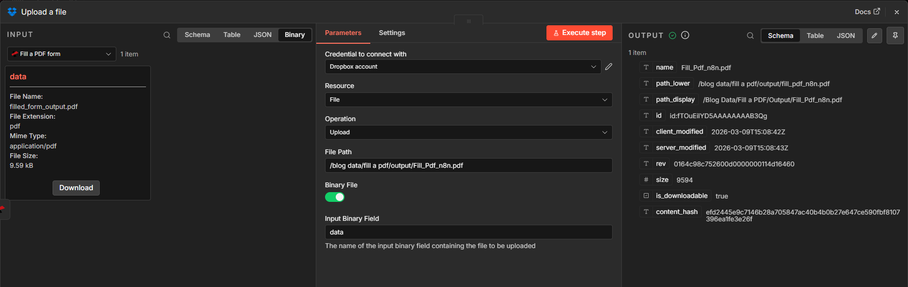 data, Form Data (JSON) with field names and values. - Upload a file (Dropbox) — Saves the filled PDF to your output folder.