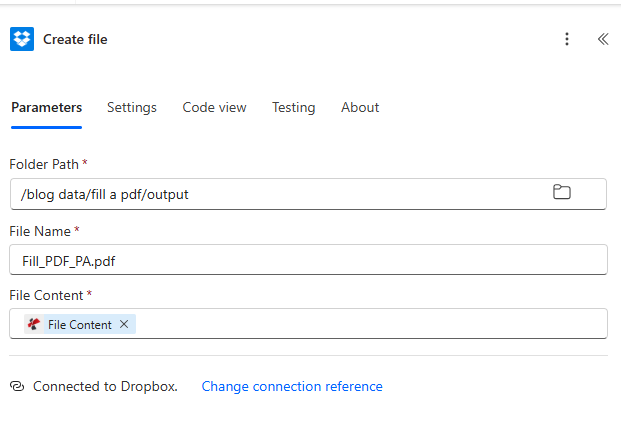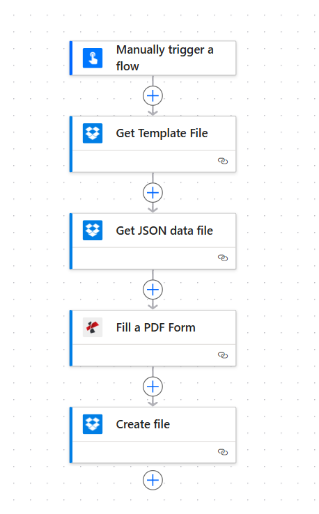 - Create file (Dropbox or SharePoint) — Saves the filled PDF to your output folder.