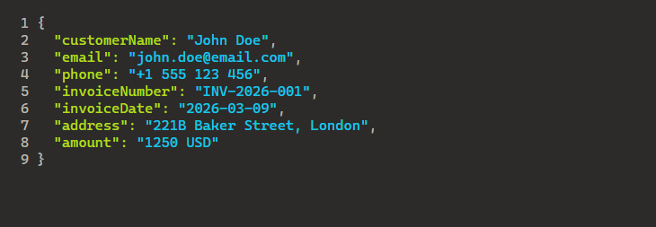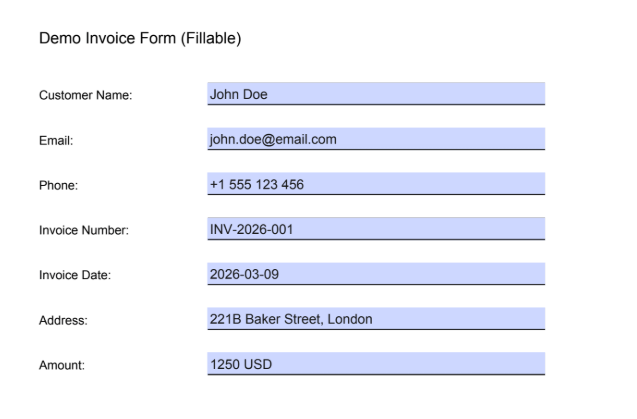 Why use JSON to fill PDF forms? JSON keys map directly to form field names (customerName, email, invoiceNumber, and so on). Your data lives in Excel, Dynamics, or databases; JSON is the common bridge. One template, many fills: reuse the same form with different JSON for bulk automation.