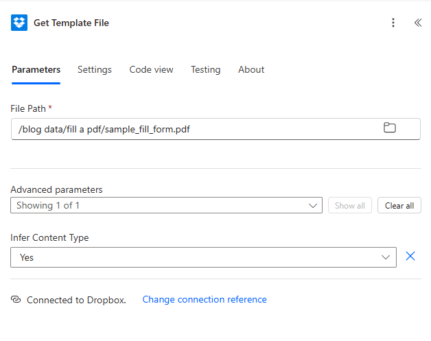 - Add Dropbox (or SharePoint) → Get file content using path (you can name it "Get Template File" in Settings).