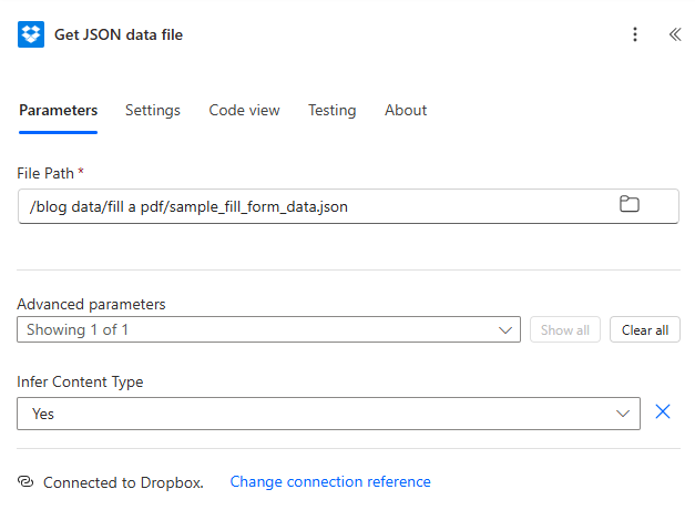 - Add Dropbox (or SharePoint) → Get file content using path (name it "Get JSON data file" in Settings).