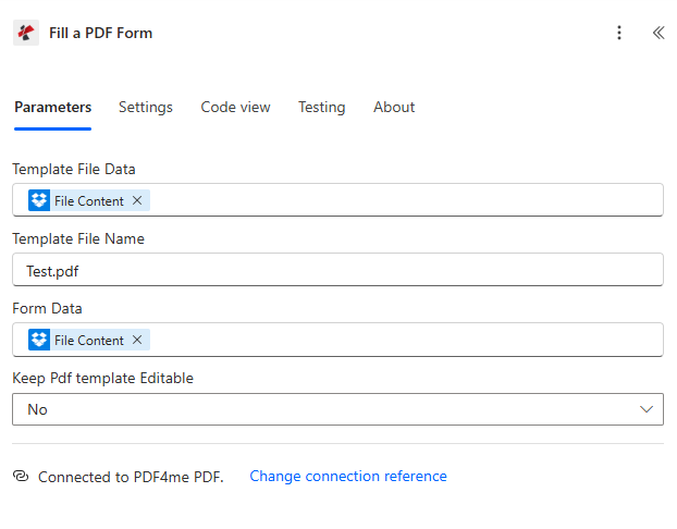 - Run the action. The output File Content will be passed to Fill a PDF Form as Template File Data.