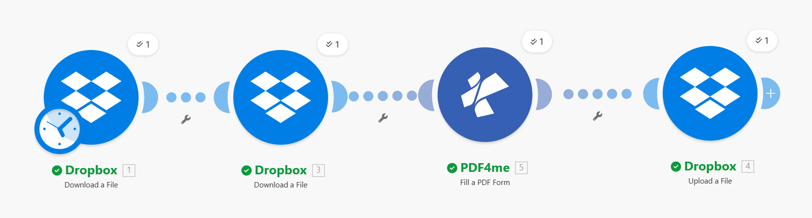 In a nutshell: Dropbox – Download a File (template, e.g. /Generate document Mail Merge/Google Docs Template.docx) → Dropbox – Download a File (JSON data, e.g. /Generate document Mail Merge/Google Docs data.json) → PDF4me – Generate Document (Template File Type: Google Docs, Output Type: Pdf or Word, map Template and Document Data from steps 1 and 2) → Dropbox – Upload a File to your output folder. Result: one generated PDF or Word document per run.