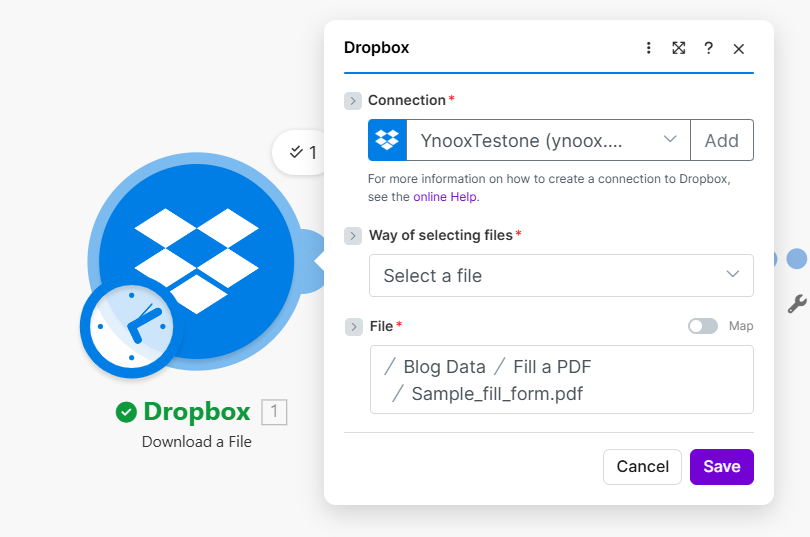 - Connection — Select your Dropbox connection (e.g. YnooxTestone).