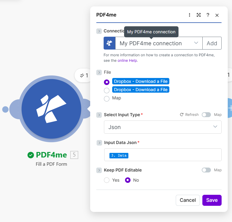 - Document Data File — Map the second Dropbox Download output (e.g. 2. Data). Alternatively, use Document Data Text and paste or map a JSON string.