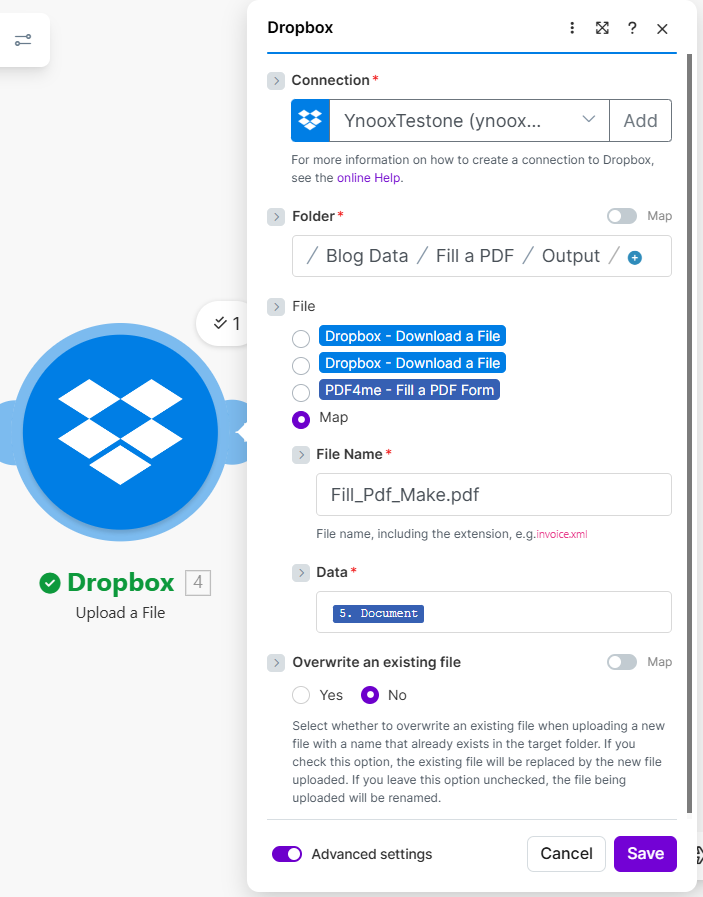 - Dropbox – Upload a File (6) — Saves the generated document to the output folder. File content from PDF4me Document; set File Name and Overwrite an existing file (Yes/No) as needed.