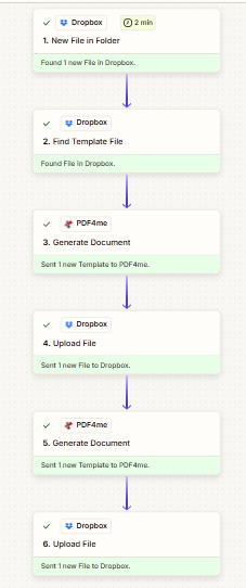 Why Zapier? Dropbox’s New File in Folder trigger plus PDF4me’s Generate Document action connects to thousands of other apps. You can extend the Zap with filters, paths, or notifications without code.