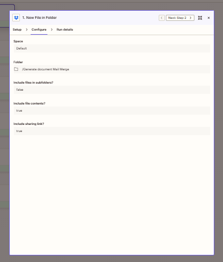 | New File in Folder | Folder, file contents | /Generate document Mail Merge; Yes |