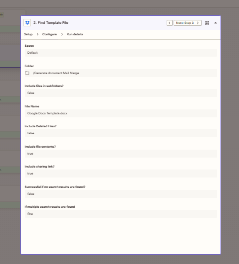 /Generate document Mail Merge. Include file contents: Yes. Include sharing link: Yes (if offered). - Dropbox – Find a file (or search by path/name) — Same folder. File name: