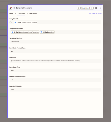 [{"name":"Alice Johnson","course":"Intro to Automation","date":"2026-03-10","instructor":"Mr. Smith"}]). Input Data Type — json. - Output Document Type — pdf. Keep Pdf Editable — false.