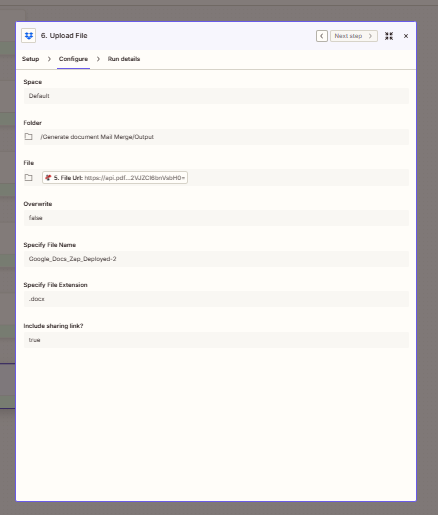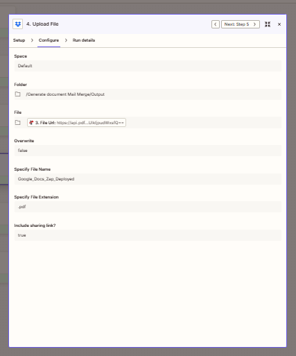 | Upload File | Folder, file, name | .../Output; step 5; Google_Docs_Zap_Deployed-2.docx |