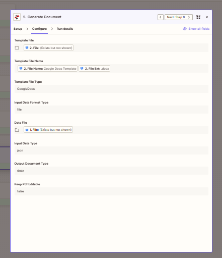 /Generate document Mail Merge/Output. File: output URL or file from step 3. Overwrite: No. File name:Google_Docs_Zap_Deployed. Extension:.pdf. - PDF4me – Generate Document — Template from step 2. Input Data Format Type: file. Data File: from the trigger (step 1). Input Data Type: json. Output Document Type: docx.
