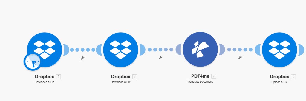 In a nutshell: Dropbox – Download a File (Word template, e.g. /Generate document Mail Merge/simple_mail_merge_template.docx) → Dropbox – Download a File (JSON data, e.g. /Generate document Mail Merge/sample_mail_merge_data.json) → PDF4me – Generate Document (Template File Type: Mail Merge, Output Type: Pdf or Word, map Template and Document Data from steps 1 and 2) → Dropbox – Upload a File to your output folder. Result: one generated PDF or Word document per run.