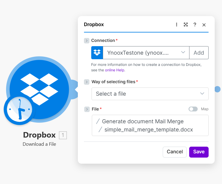 | Dropbox Download (1) | File | /Generate document Mail Merge/simple_mail_merge_template.docx → Template + Template Name |