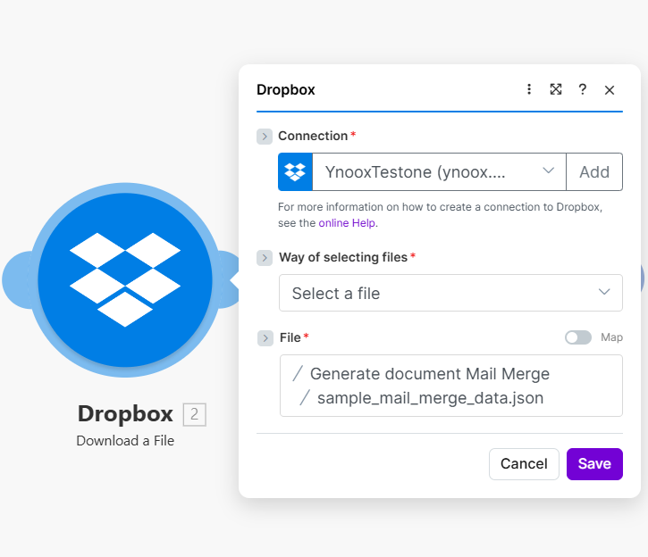 | Dropbox Download (2) | File | /Generate document Mail Merge/sample_mail_merge_data.json → Document Data File (2. Data) |