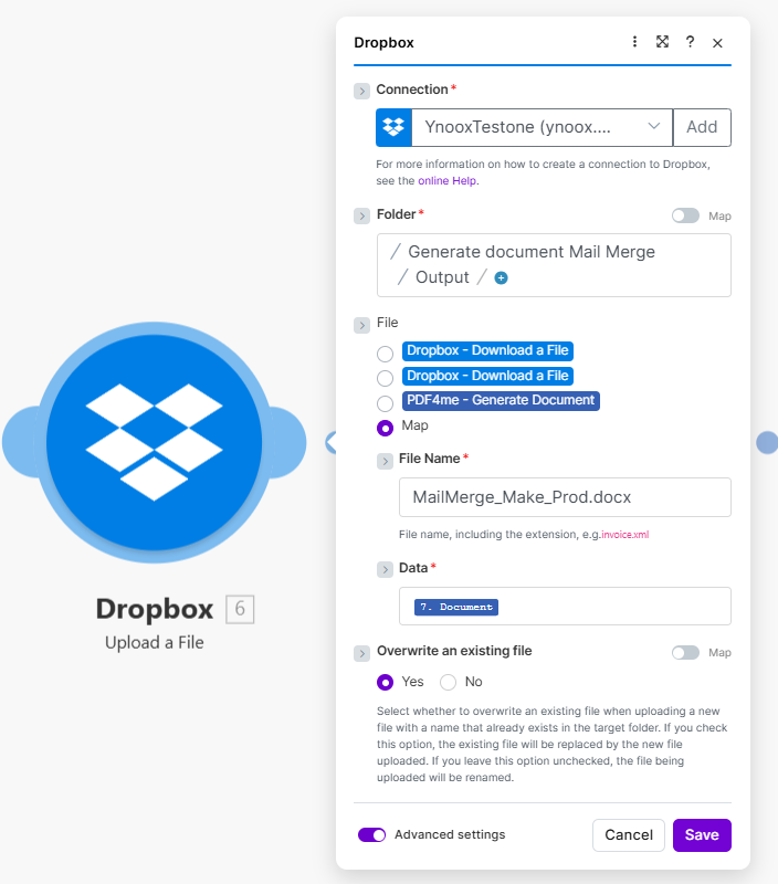 | Dropbox Upload | Folder, File, File Name | /Generate document Mail Merge/Output/, 7. Document (or 8. Document), MailMerge_Make_Prod_2.pdf or MailMerge_Make_Prod.docx |