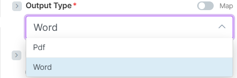Fact-checked: Output Type * required; choose Pdf for PDF or Word for .docx. Map toggle available for dynamic output format.