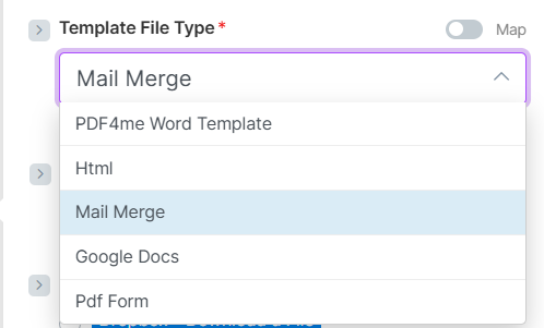 - Template File Type * — Select Mail Merge from the dropdown. (Other options in the UI: PDF4me Word Template, Html, Google Docs, Pdf Form.)
