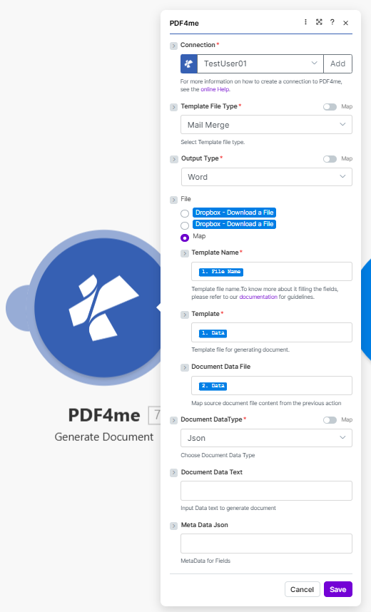 Fact-checked: Connection (e.g. TestUser01); Template File Type Mail Merge; Output Type Pdf or Word. File = Dropbox Download (template); Document Data File 2. Data from Download 2, or Document Data Text with JSON (e.g. firstname, lastname, gender, member). Document DataType Json. Output Document used in Upload.