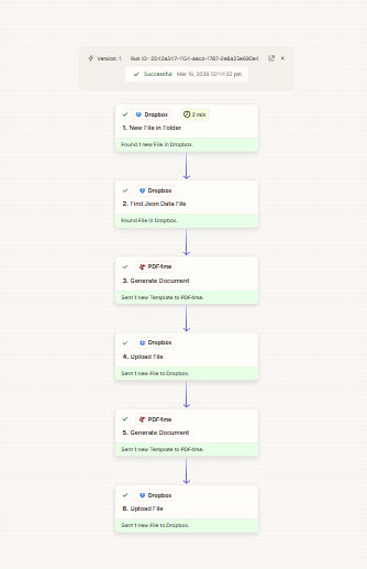 Drop a Word template (e.g. simple_mail_merge_template.docx) into a Dropbox folder and keep a JSON file (e.g. sample_mail_merge_data.json) in the same place. When a new file appears, Zapier can run a mail merge: find the JSON, call PDF4me – Generate Document (Template File Type: Mail Merge), upload Word, run Generate Document again for PDF, then upload. Six steps. Trigger-based. No manual run.
