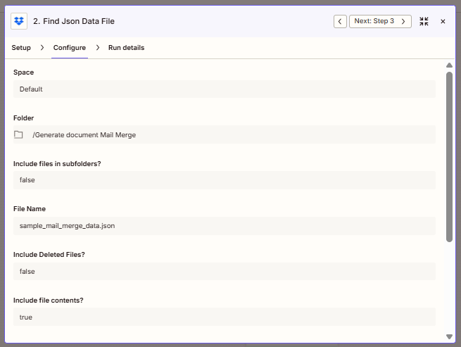 Trigger: A new file in the watched Dropbox folder (e.g. a new or updated template). Input: The triggering file as template and a fixed JSON file (sample_mail_merge_data.json) in the same folder. Output: Word and PDF in /Generate document Mail Merge/Output as Mail_Merge_Zap_deployed.docx and Mail_Merge_Zap_deployed-2.pdf (or your chosen names). Overwrite off so prior runs are kept unless you change names.