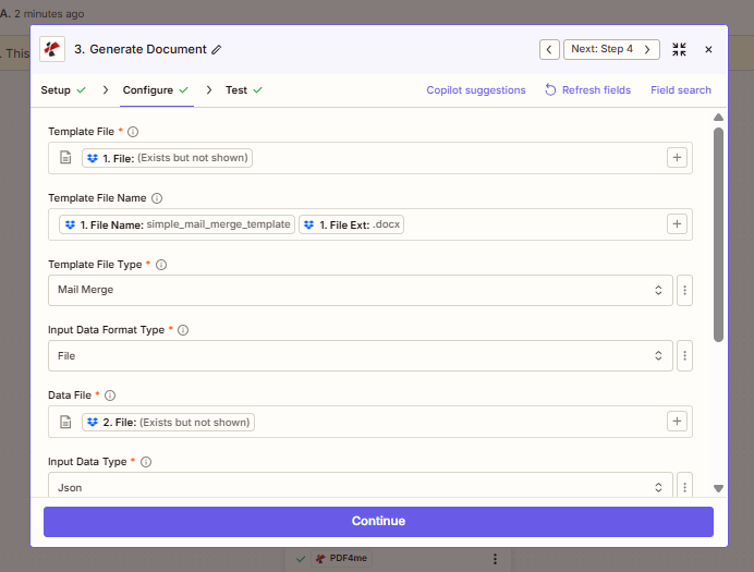 In Zapier, open the field picker and choose step 1 for the template file and step 2 for the JSON file. Re-test each PDF4me action after changing mappings.