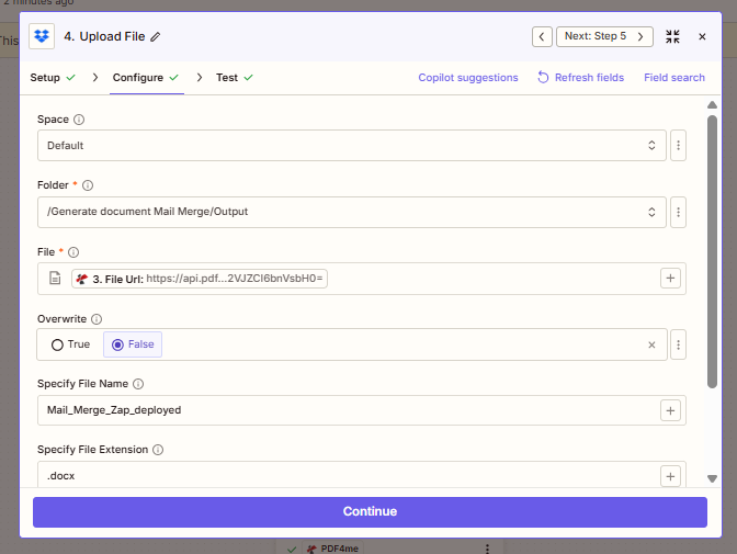 /Generate document Mail Merge/Output. File from step 3. Overwrite: No. Name:Mail_Merge_Zap_deployed. Extension:.docx. - PDF4me – Generate Document — Same template (step 1). Template File Type: Mail Merge. Input Data Format Type: Text. Data Text — JSON (from step 2 content or a fixed sample). Input Data Type: Json. Output: Pdf where the action exposes it.