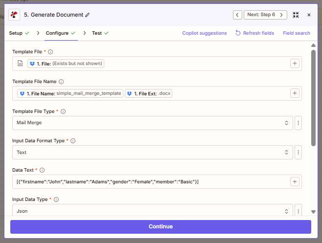 sample_mail_merge_data.json, include file contents: Yes. - PDF4me – Generate Document — Template from step 1. Template File Type: Mail Merge. Input Data Format Type: File. Data File from step 2. Input Data Type: Json.