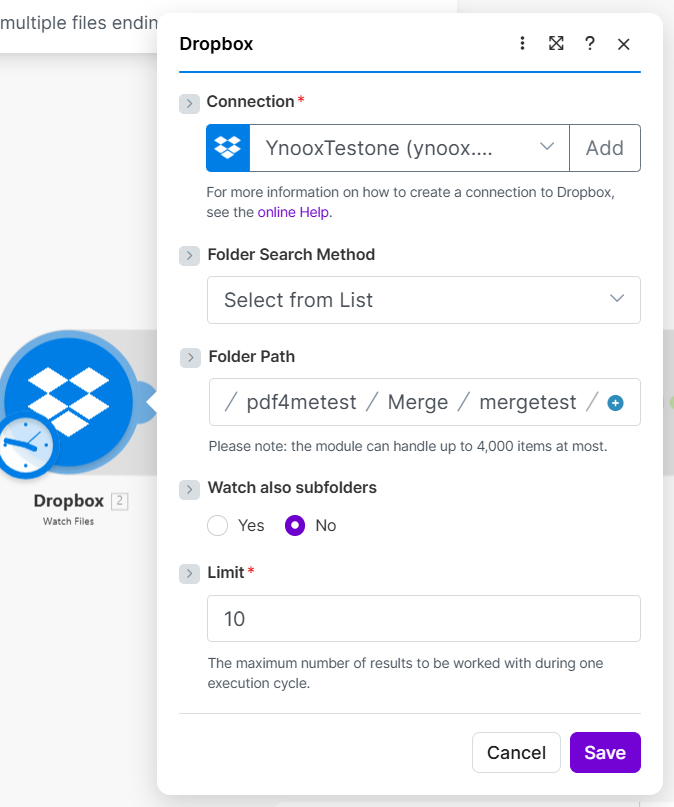 Dropbox – Watch Files returns an array of file objects (each with path, name, size, etc.). PDF4me – Merge Multiple PDFs needs an array of file content (binary data), not metadata. To get the content, you must download each file. But Download a File works on one file per run—it needs a single path.