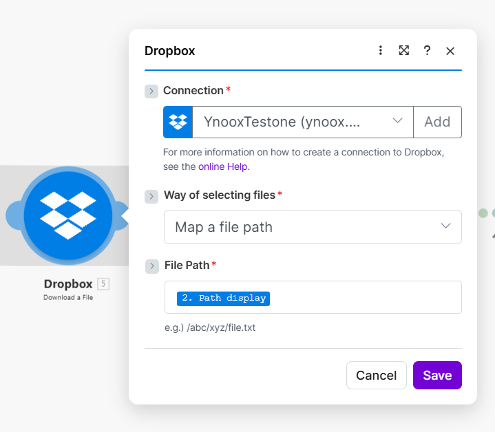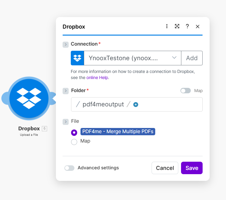 - Add Dropbox → Upload a File and connect it to the Merge module.