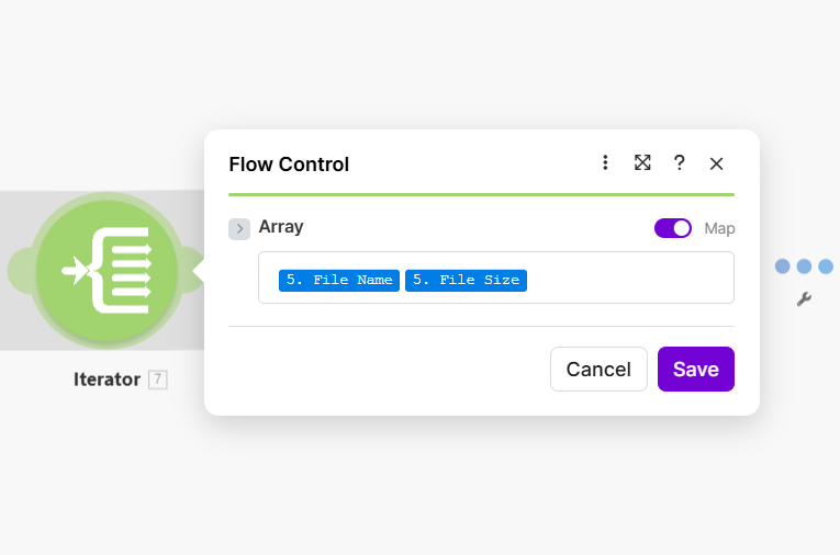 - Array — Enable Map and select the array from Watch Files. You can map fields such as 5. File Name and 5. File Size (or the equivalent from your Watch Files module) so the Iterator knows what to iterate over. The Iterator exposes the current item’s fields (e.g. Path display, File Name) to modules in its route.