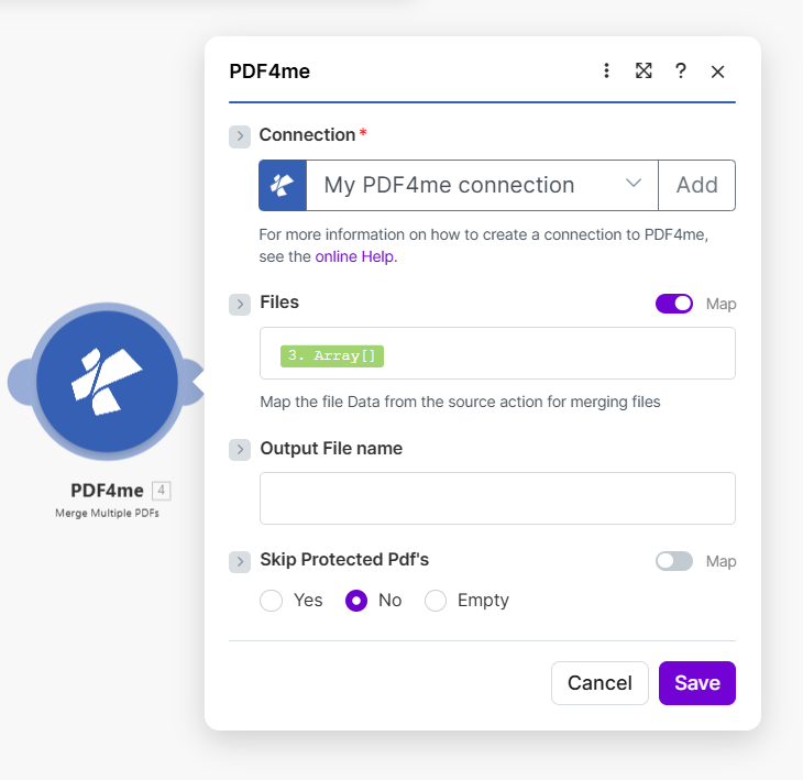 ![PDF4me Merge Multiple PDFs: Files mapped to 3. Array[], Output File name, Skip Protected Pdf's](/assets/images/blog/merge-files-make/merge-files-make-5-merge-pdfs.png)