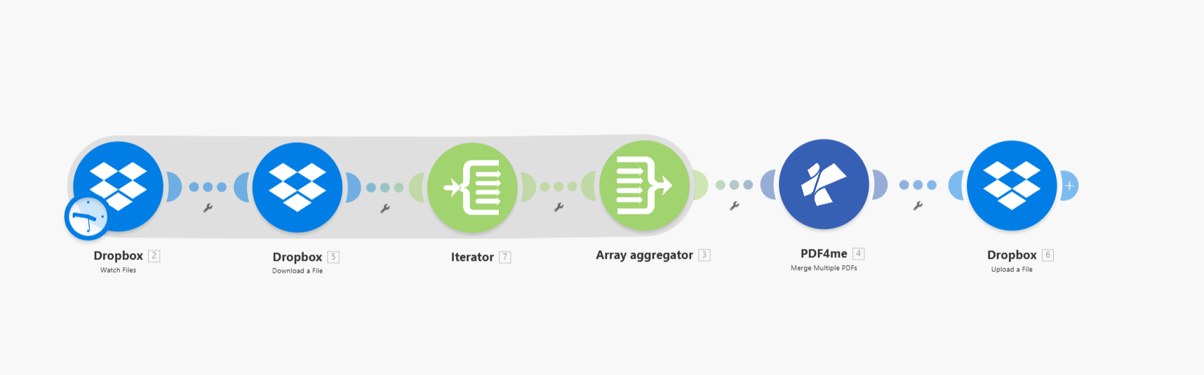 You have multiple PDFs in a Dropbox folder and want them merged into a single PDF automatically. The catch: PDF4me Merge Multiple PDFs expects an array of file data, but Dropbox Watch Files returns a list of file metadata—and Download a File returns one file at a time. To bridge that gap, you need Iterator and Array Aggregator: the Iterator processes each file one by one, and the Array Aggregator collects those results into the array that Merge expects.