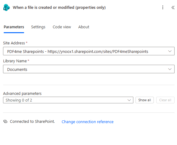 - Use the same Site Address and Library Name as the trigger.