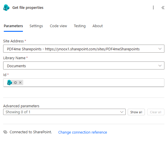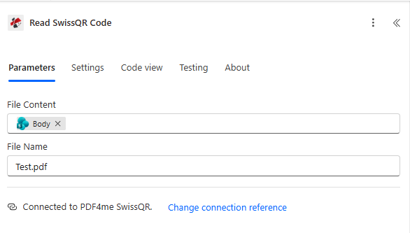 Test.pdfor use the Name field from the "Get file properties" action by selecting it from dynamic content. - Ensure you're Connected to PDF4me SwissQR (use your PDF4me API key in the connection).