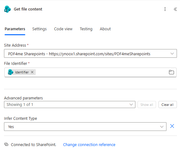 - Get file content — Retrieves the actual PDF binary from SharePoint (using Identifier from the previous step; set Infer Content Type to Yes).