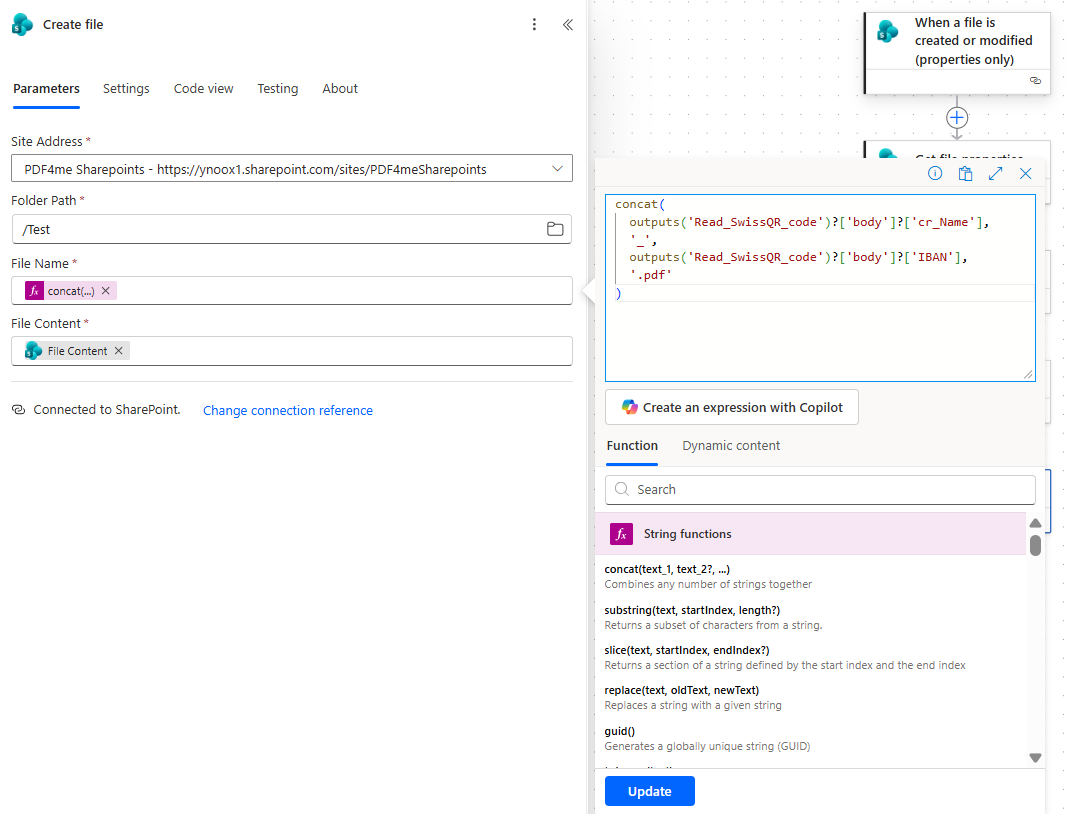 Save the file in SharePoint with a new name built from the Read SwissQR Code output.